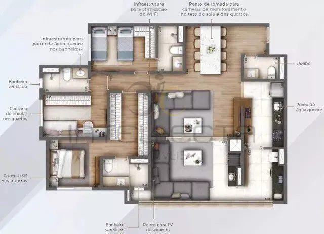 Área de lazer completa: hall social, pet place, bicicletário, salão de jogos, academia, salão de festas, espaço gourmet, churrasqueira, brinquedoteca, playground, quadra recreativa, piscinas com solarium, bangalôs e deck molhado.